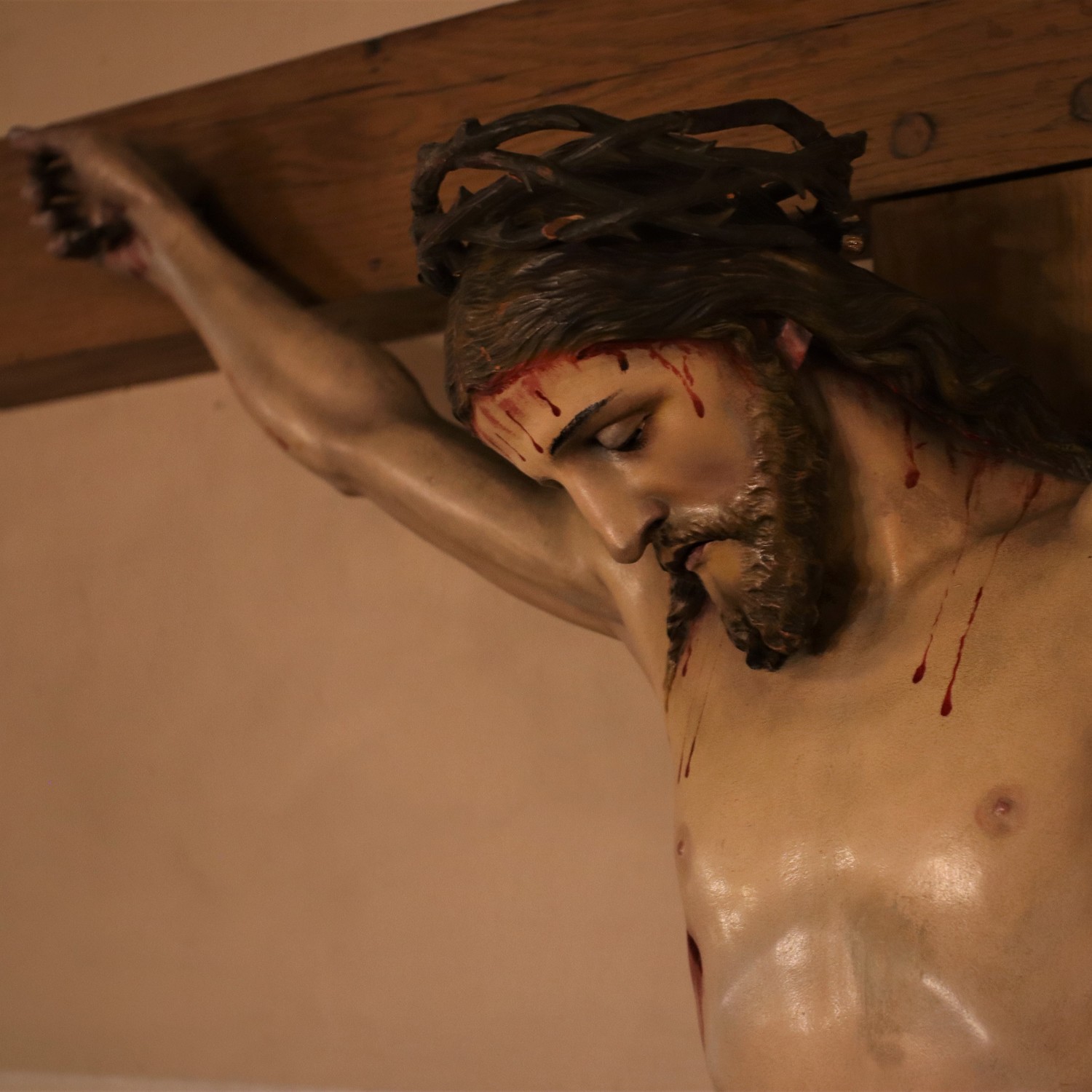 Das Holzkreuz mit dem Gekreuzigten weißt eine naturalistische Darstellung des 19. Jahrhunderts auf.