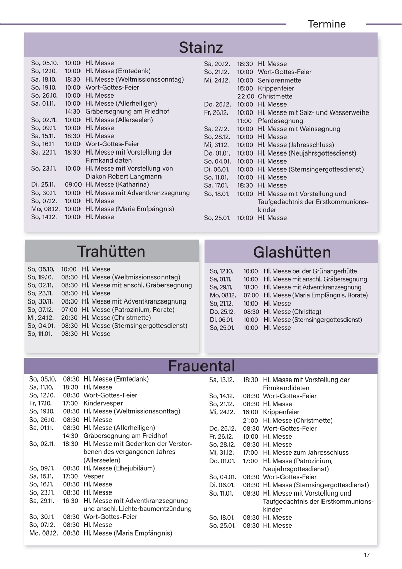 Bad Gams 14:30 Uhr / Deutschlandsberg 14:30 Uhr / Frauental 14:30 Uhr / St. Jakob 8:30 Uhr / St. Josef 15:00 Uhr / Stainz 14:30 Uhr / St. Stefan 13:30 Uhr